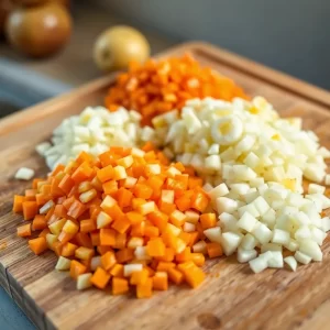 - Kuori ja pilko sipuli, porkkanat ja perunat pieniksi kuutioiksi.